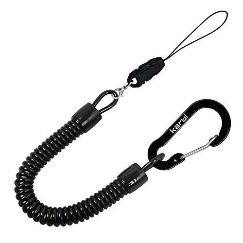 Karuiのカールコードストラップは、伸縮性のある太めのコイルタイプで、ロック機能付き。カラビナリング付きで、スマホや定期などの落下・盗難・紛失防止に最適なユニセックスデザイン。ブラックの2個セット。