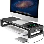 VAYDEER モニター台はUSB 3.0対応のディスプレイスタンドで、ワイヤレス充電機能付き。幅54cm、金属製で頑丈。高速データ転送とキーボード収納が可能で、机上をスッキリさせます。