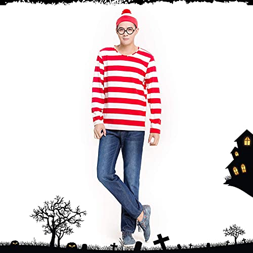 ウォーリーのコスプレ衣装は、赤と白のストライプシャツ、デニムパンツ、赤いニット帽、メガネが特徴です。ハロウィンパーティーやイベントにぴったり。サイズも豊富で、男女兼用のスタイルです。