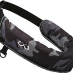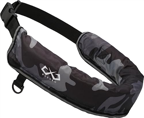 JES-BASARO手動膨張式ライフジャケットは、釣りやアウトドアに最適な腰巻きベルトタイプで、大人用・子供用対応。日本国内メーカー製、CO2高圧縮ボンベ付き、ブラック迷彩デザイン。日本語説明書付。