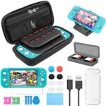 Nintendo Switch Lite用の17点セット。収納ケース、ハードカバー、強化ガラスフィルム、ゲームカードケース、親指キャップ、充電ケーブル、スタンド、清潔アクセサリーが含まれ、大容量で軽量、衝撃防止、携帯便利です。