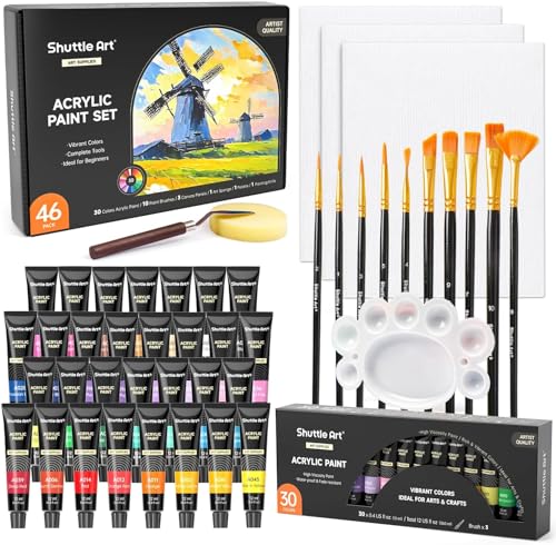 Shuttle Artのアクリル絵の具46点セットは、30色の速乾性顔料を含み、ペイントブラシ10本やパレット付き。12mlチューブで布、石、ガラス、セラミックに対応。初心者から専門家まで使える美術道具です。