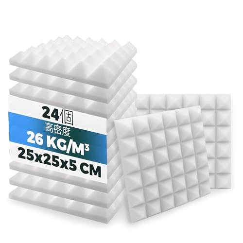 Arrowzoomの吸音材(白)24枚セット。サイズ25×25×5cmの難燃性吸音ボード。防音対策に最適。硬質吸音フェルト製で、両面テープ付き。