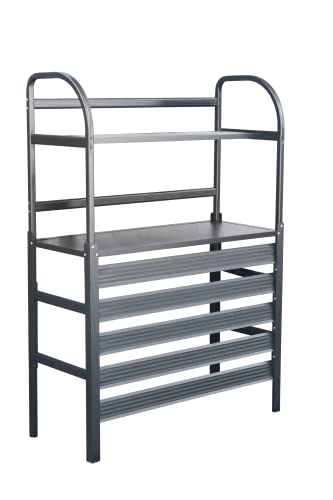 リビングアウトのアルミ製室外機カバーは、奥行38.3cm、高さ109.5cm、幅90cm。棚付きで節電効果あり。通気性と遮光性を兼ね備えたルーバータイプで、プランターラックとしても利用可能。サビに強くスタイリッシュなデザインです。