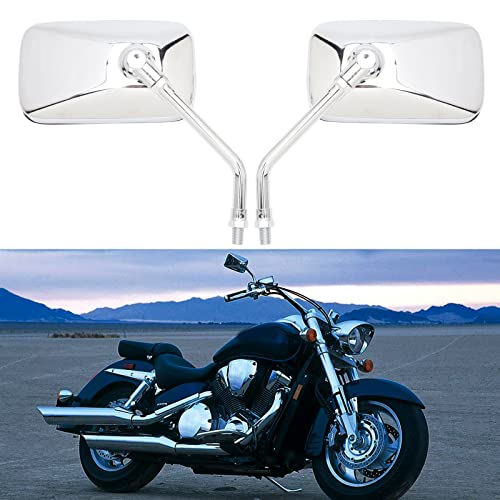 バイクミラー左右セット、10mm正ネジで取り付け可能。メッキ仕上げの四角形デザイン、調節可能でカワサキやホンダなど汎用性あり。