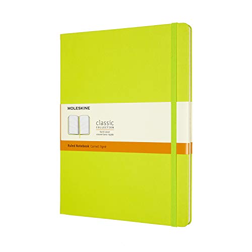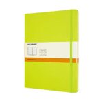 モレスキンのクラシックノートブック、ハードカバーのXLサイズ(横19cm×縦25cm)です。横罫タイプで、レモングリーンカラーのデザインが特徴的です。高品質の紙を使用しており、書き心地も抜群です。