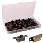 このミニスライドスイッチは、150個入りのON/ONタイプで、定格0.5A、50V DCの仕様です。2ポジション、3ピン接続が可能で、さまざまな電気機器の電源制御に最適です。