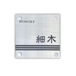 シンプルでおしゃれなステンレス製表札。ヘアライン加工と化粧ビス使用で高級感あり。サイズ120mm×120mm、黒文字。新築祝い、引越し祝いに最適です。