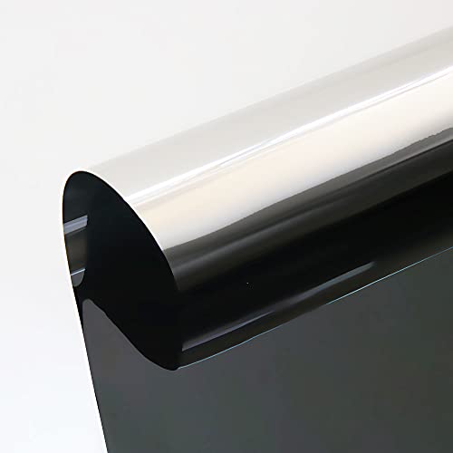 窓用フィルムは、目隠しや防犯、遮光、断熱、遮熱、紫外線対策に優れた製品です。飛散防止や省エネ効果もあり、網入りガラスにも適用可能。サイズは45cm X 2mで、黒い銀色のミラーフィルムです。