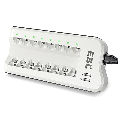 EBL電池充電器は8スロットを持ち、単3・単4のニッケル水素/ニカド充電池に対応しています。USB充電機能もあり、スマホへの給電と同時充電が可能です。