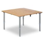 FIELDOORのバンブーテーブルは、60cm×60cmサイズで無段階高さ調節が可能です。四つ折りコンパクト収納でき、収納バッグも付属。キャンプやアウトドア、バーベキューに最適です。