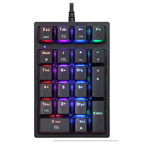 21キーの有線テンキーパッドキーボード。RGBバックライト搭載で、持ち運びやすく人間工学デザイン。青軸タイプで快適なタイピングを提供。1年間の品質保証付き。