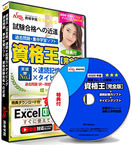 移動式クレーン運転士学科試験対策のソフトです。速読術、記憶力、タイピングトレーニングが含まれ、過去問を使った集中学習が可能。特典も付いており、効率的に資格取得を目指せます。