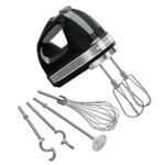 キッチンエイドのハンドミキサーは、9段階変速で、混ぜる、泡立てる、こねる、あわ立てるの1台4役をこなします。収納バックが付いており、スタイリッシュなシャイニーブラックのデザインが特徴です。