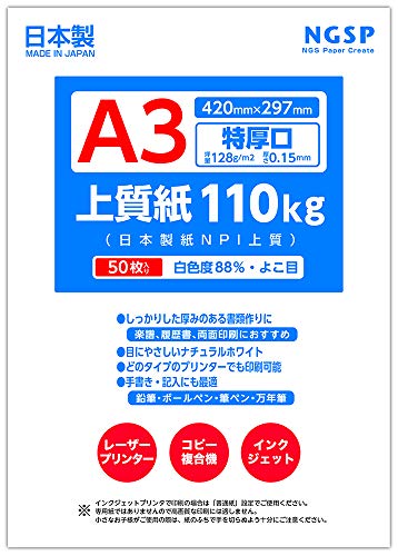 特厚口A3上質紙110kgは、日本製紙NPI製で高品質です。50枚入りで、印刷やコピーに最適。優れた白色度と手触り感を持ち、プロフェッショナルな仕上がりを提供します。耐久性にも優れています。