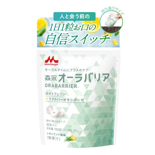 森永乳業のオーラバリアは、お口の臭いケアに特化したサプリメントです。1袋に30粒入り、レモンミント風味で子供にも安心。ラクトフェリンとラクトパーオキシダーゼ配合で、臭いをしっかり対策します。