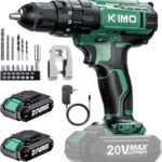 KIMOの20V電動ドライバーは、最大35N.mのトルク、13本のビット、軽量1.24kgで使いやすい。無断変速、二段変速、LEDライト、18段階トルク調節、充電式でDIY初心者にも最適。PSE認証済み。