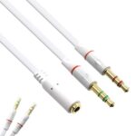 ANEのオーディオ変換ケーブルは、4極ステレオ端子をマイクとヘッドホン信号に分岐。4極メスから3極オス2つに接続、CTIA規格対応。PCやスマホでマイク付きイヤホン使用可能(iPhone/Xperia純正非対応)。色はホワイト。