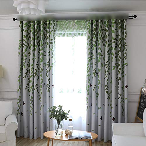 Pureaquの田舎風遮光カーテンは、緑の葉とツバメのデザイン。遮熱・断熱効果で昼夜目隠し可能。省エネで、リビングや寝室に最適。2枚入り、幅100cm×丈230cm。