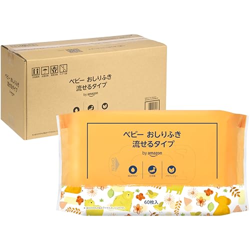 Amazonのベビーおしりふきは、純水99%の流せるタイプで、日本製です。パラベンフリーで無香料、60枚入りが24個(計1440枚)セット。赤ちゃんの肌に優しい設計です。