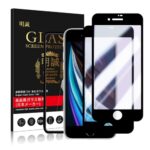 明誠のiPhone SE3/SE2用ガラスフィルム。ブルーライトカット、3D曲面、0.2mm厚で高透明度。日本製旭硝子使用で耐衝撃・指紋防止。ガイド枠付き、ブラック仕上げの2枚セット。
