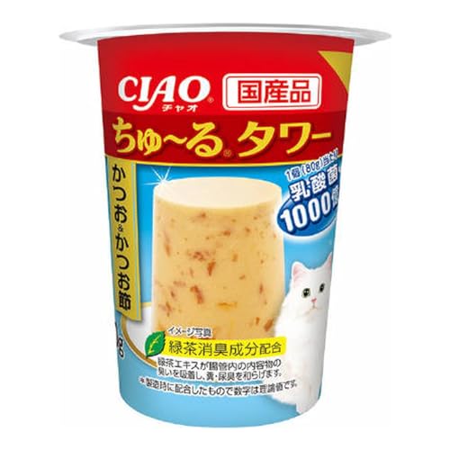 チャオ ちゅ〜るタワー かつお&かつお節 80gは、猫用のおやつです。豊かなかつお風味と旨味たっぷりのかつお節を使用し、猫ちゃんが喜ぶこと間違いなしの一品です。