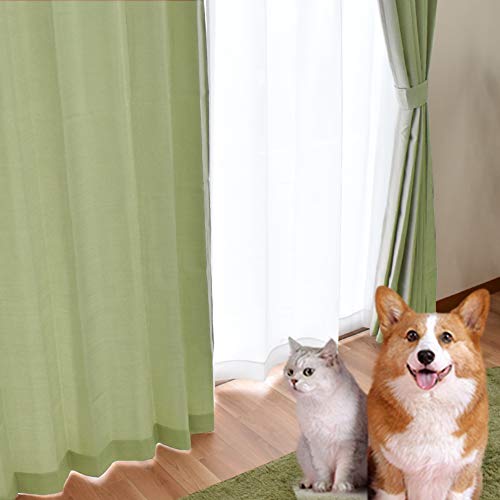 ペットのお悩み解消のドレープカーテン。爪が引っ掛かりにくい強化素材使用。撥水・抗菌・防臭・防汚機能付き。遮光3級で、100×178cmの2枚組。洗えるウォッシャブル仕様。シンプルな無地、タッセル付きグリーン。
