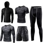 コンプレッションウェア5点セット(パーカー、長袖・半袖シャツ、ハーフパンツ、タイツ)は、通気性と防臭効果があり、吸汗速乾機能も備えたメンズトレーニングウェアです。