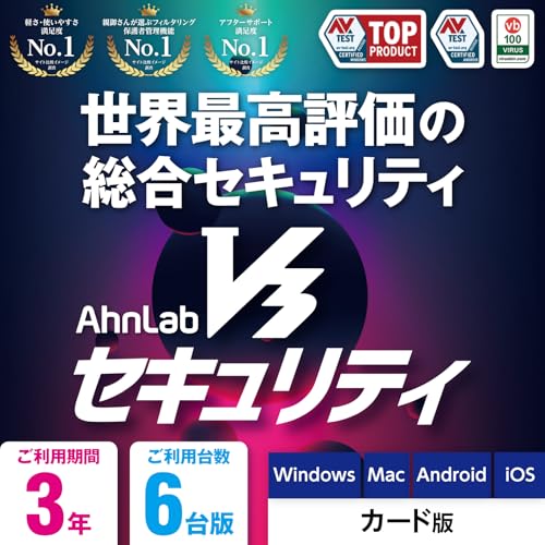 アンラボ V3 セキュリティ 3年6台版は、Windows、Mac、iPhone、Android対応の高機能セキュリティソフトです。ウィルス対策やチャイルドブロック機能を搭載し、安心してインターネットを利用できます。ダウンロードカード版。