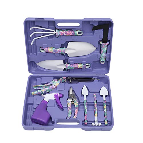 Culturaltuのガーデニングツール10点セットは、移植作業や雑草取りに最適なアイテムが揃っています。カラーはパープルで、使いやすいデザインのシャベル、熊手、はさみ、霧吹きなどが含まれています。
