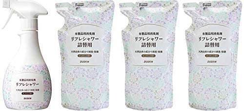 ダスキン リフレシャワーのスプレー付本体1個と詰替用3個セットです。手軽に使用でき、清潔感あふれる空間を演出。日常の掃除や衛生管理に最適なアイテムです。