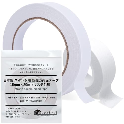日本製の防音ファストラボ® スポンジ用超強力両面テープ。15mm幅、20m長さで、ウレタン、フェルト、布、発泡スチロールなどの接着が可能。接着しにくい素材に特化し、高い吸音効果を発揮します。