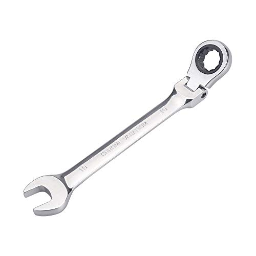 ラチェットレンチとメガネレンチのセットで、15mmサイズの整備工具です。車やバイクのメンテナンス、家具組み立てにも対応。鏡面仕上げで、角度調整が可能なため、使いやすく便利です。