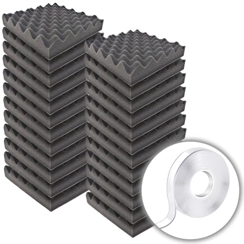 【波型5cm 24枚セット】の防音ファストラボは、極厚のウレタンフォームスポンジで、吸音・緩衝材として最適です。サイズは25cm×25cm、密度は26kg/m3。両面テープが付属し、取り付けも簡単です。