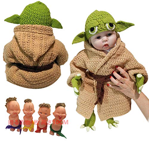 スターウォーズのヨーダをイメージしたキッズコスチューム。男女共用の着ぐるみで、ヘアバンド付き。赤ちゃんの写真撮影や出産祝いに最適な5ピースの手編みスーツです。
