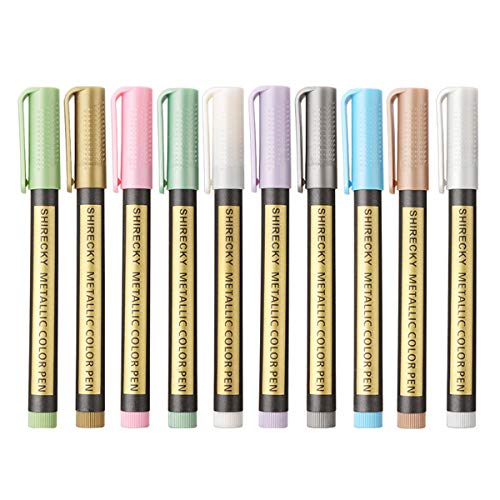 10色の水性グリッターラメペンセット。金属色系(白・金・銀・ピンク・緑・紫・黒・茶・青・オリーブグリーン)で、イラストやデコレーションに最適。ガラス、磁器、布にも使用可能。