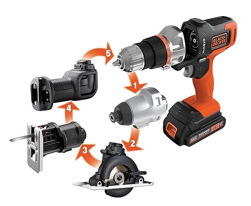 ブラックアンドデッカーの18VマルチツールEVO185E1は、コードレスでインパクトドライバー、ドリルドライバー、丸ノコ、ジグソー、レシプロソーを1台でこなします。ビットとバッテリー付きで、DIYに最適です。