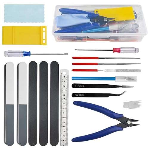 WMYCONGCONGのプラモデル用工具19点セットは、初心者向けの入門ツールで、薄刃ニッパーやファイル、ドライバー、精密ピンセットを含む。便利な収納ケース付きで、模型の製作や修理に最適なクラフトツール。