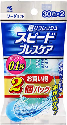 スピードブレスケア プチッと瞬間息リフレッシュ ソーダミントは、30粒入りのパックが2個セットになった商品で、4個パックです。手軽に口内をリフレッシュできるお手軽なミントタブレットです。