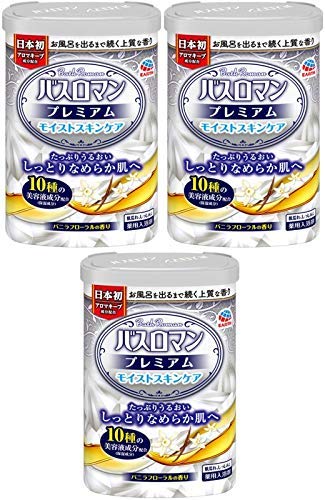 バスロマン プレミアム 入浴剤モイストスキンケアは、バニラフローラルの香りでお湯はバニラホワイトににごります。600g入りが3個セットで、肌に潤いを与えリラックス効果をもたらします。