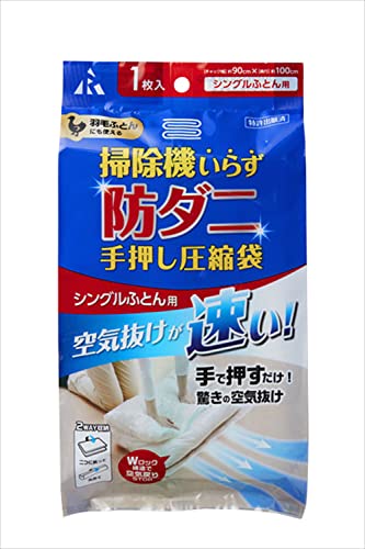 アール(R) 手押し圧縮袋は、90×100cmのシングルサイズで、特許取得済み。抗菌、防臭機能があり、防ダニシート付きで安心。掃除機不要で簡単に圧縮可能。