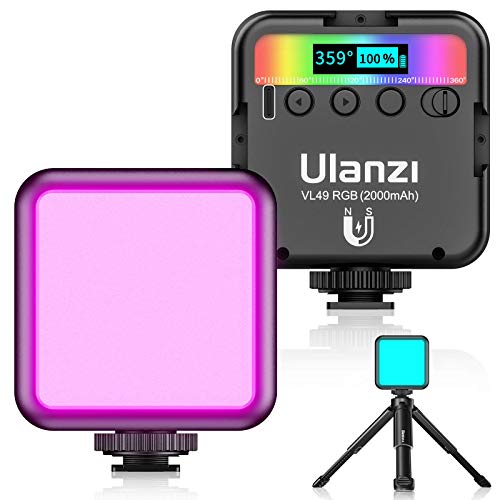 Ulanzi VL49 RGB撮影ライトは、359色のRGBモードと調整可能な明るさを持ち、9000Kの白光を提供。2000mAhのUSB充電式バッテリー搭載で、iPhoneやGoPro、各種カメラに対応。三脚付きで卓上にも最適。