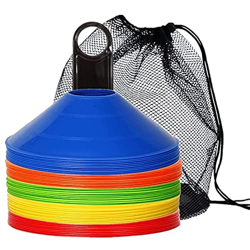Yヤクニタツの60枚5色マーカーコーンは、収納袋とラック付きで便利。割れにくく柔軟性があり、ドリブル練習やサッカー、フットサルに最適な目印として活躍します。