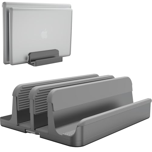 Geecolの縦置きPCスタンドは、2台のノートパソコンを収納可能。幅調整ができ、アルミ合金素材で頑丈。MacBookや全てのノートPCに対応。