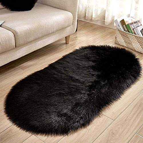 ブラックの60x120cmサイズのソフトフェイクシープスキンラグです。ベッドルームやリビングルームに最適なクッション性があり、エレガントで快適な空間を演出します。