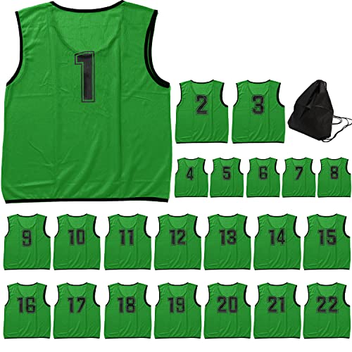 ビブス セットは22枚入りのメッシュ素材で、番号が付いています。収納バッグ付きで、サッカーやバスケ、フットサルなどの学校行事や運動会に最適。大人用グリーンカラー。