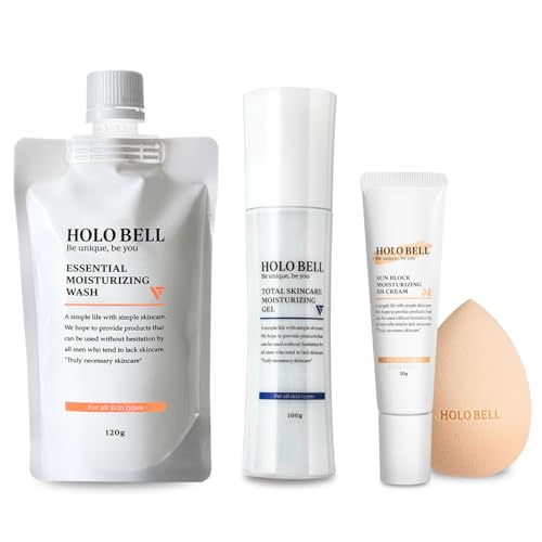 HOLO BELL 高保湿 メンズスキンケア3点セットには、洗顔料フォーム除菌、トータルスキンケア保湿ジェル100g、サンブロック保湿BBクリーム20gが含まれています。肌に潤いを与えるアイテムが揃っています。