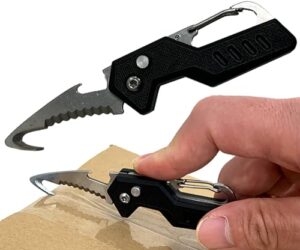 Tomicoco ダンボールカッター 段ボール開封 キーホルダー フック型 折り畳みナイフ カッター 開封道具 開梱カッター 軽量 ステンレス製 アウトドア ナイフ (Bタイプ ブラック 1個)