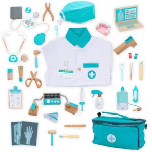木製のドクターセットで、お医者さんや歯医者さんごっこが楽しめます。ナース服と帽子も含まれており、子供たちの想像力を広げるおもちゃです。誕生日やクリスマスプレゼントに最適!