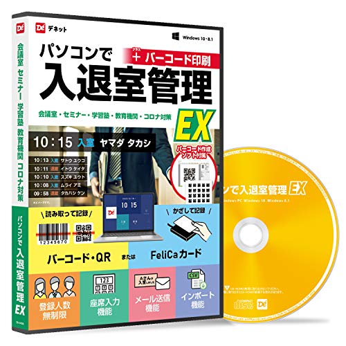 入退室管理EX+バーコード印刷は、コロナ対策のための会議やセミナー、学校での使用に最適です。FeliCaカードやQRコード、バーコードを使い、誰がどこにいつ入退室したかを記録するソフトと、バーコード作成機能が付属しています。